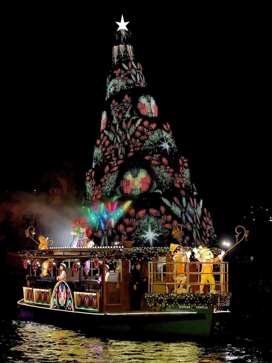 クリスマスツリーがきらめくなか、ミッキーたちがハーバーを周遊し、ゲストと一緒にクリスマスをお祝いします☆