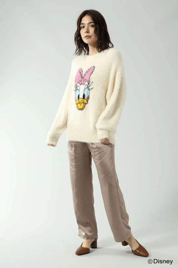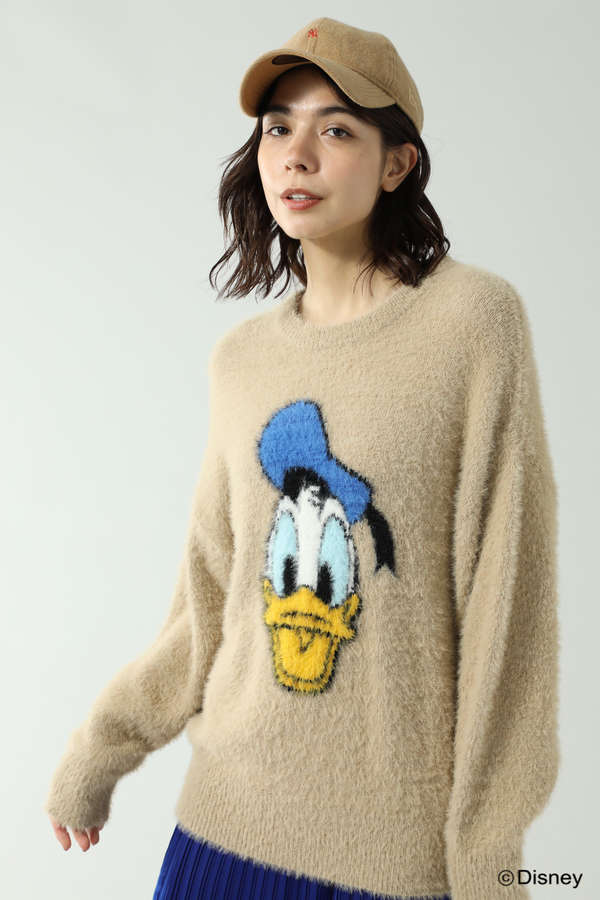 ゆったりとしたシルエットにディズニーキャラクターのフェイスがプリントされたフェザーニット。
