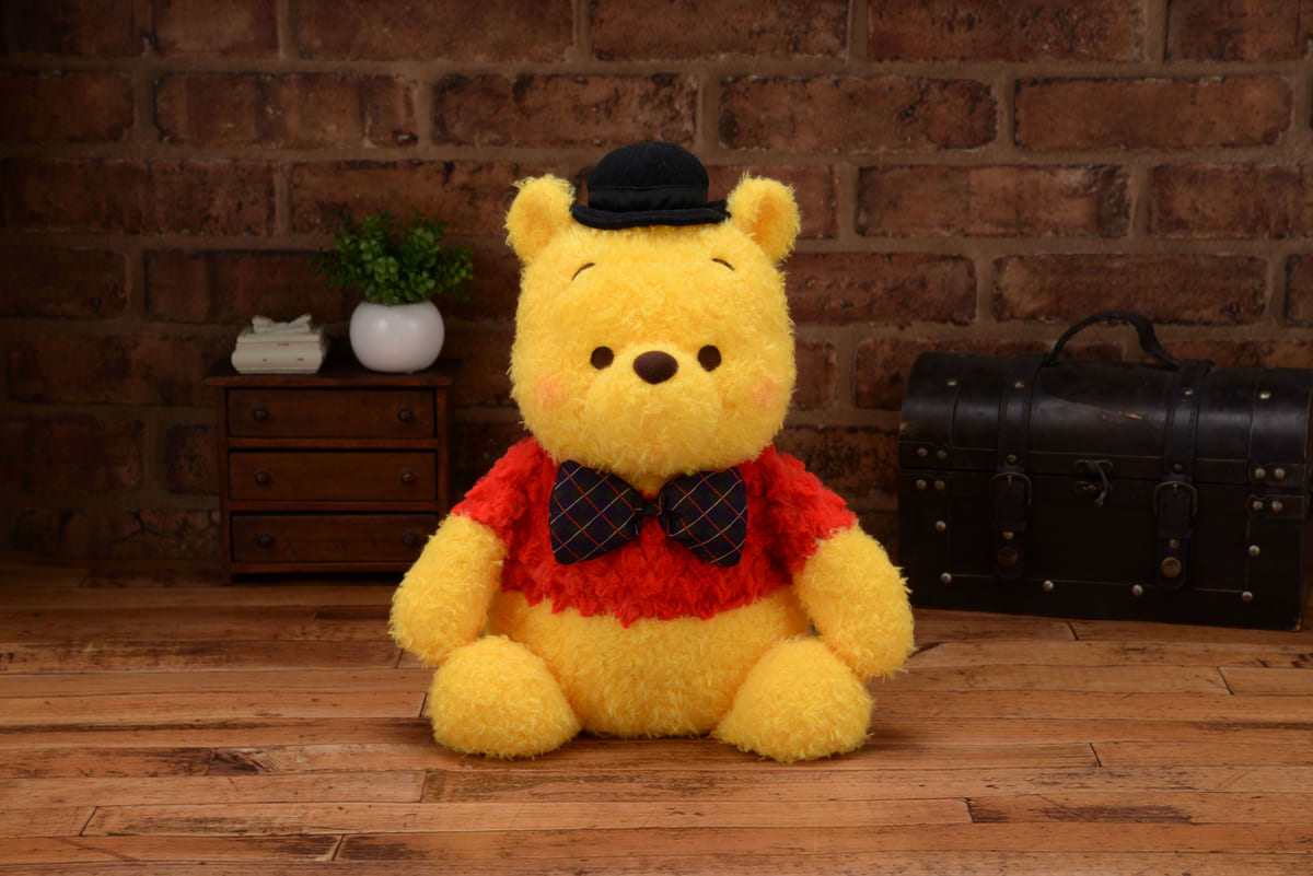 チェック柄の蝶ネクタイとシルクハットがカッコ良い、ジェントルスタイルの「くまのプーさん」