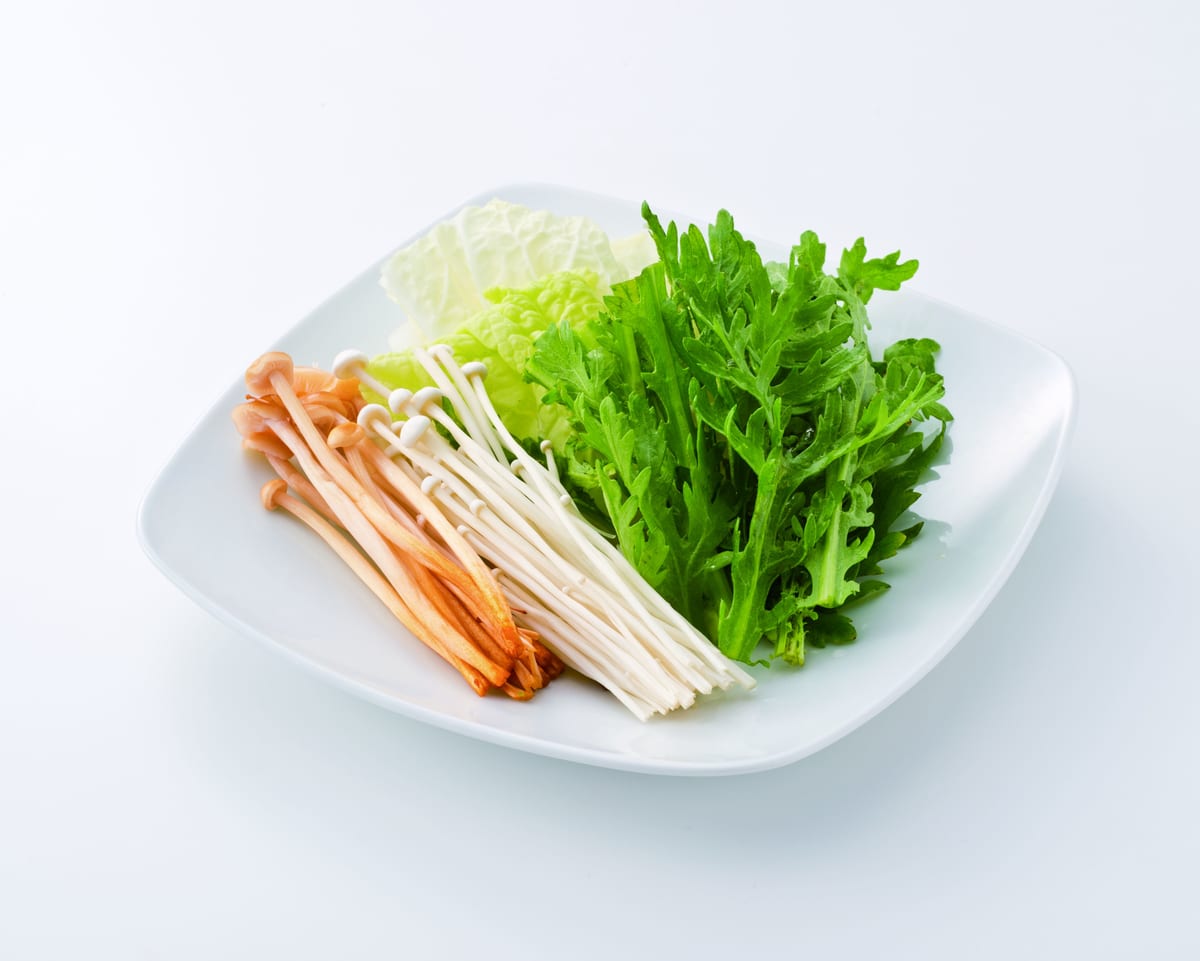 春菊・白菜・味えのき・白えのきが盛り合わせになった「すき焼き野菜盛り」