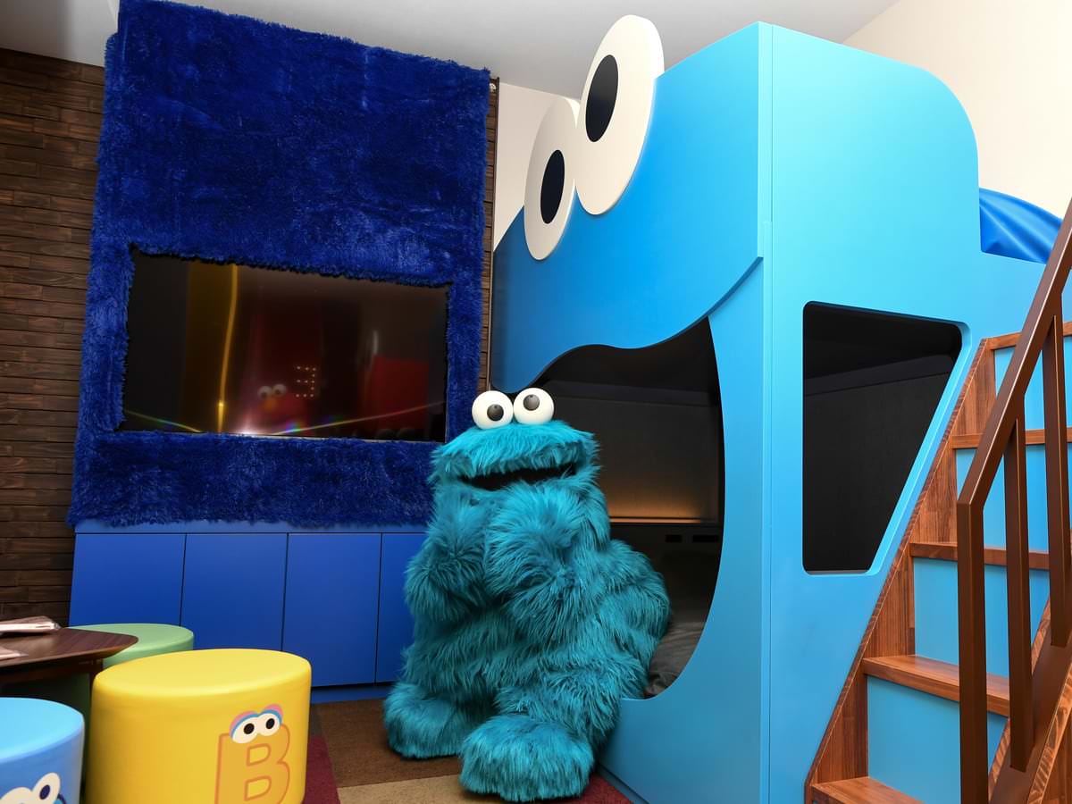 クッキーモンスターの形の2段ベッドで眠ることができます☆