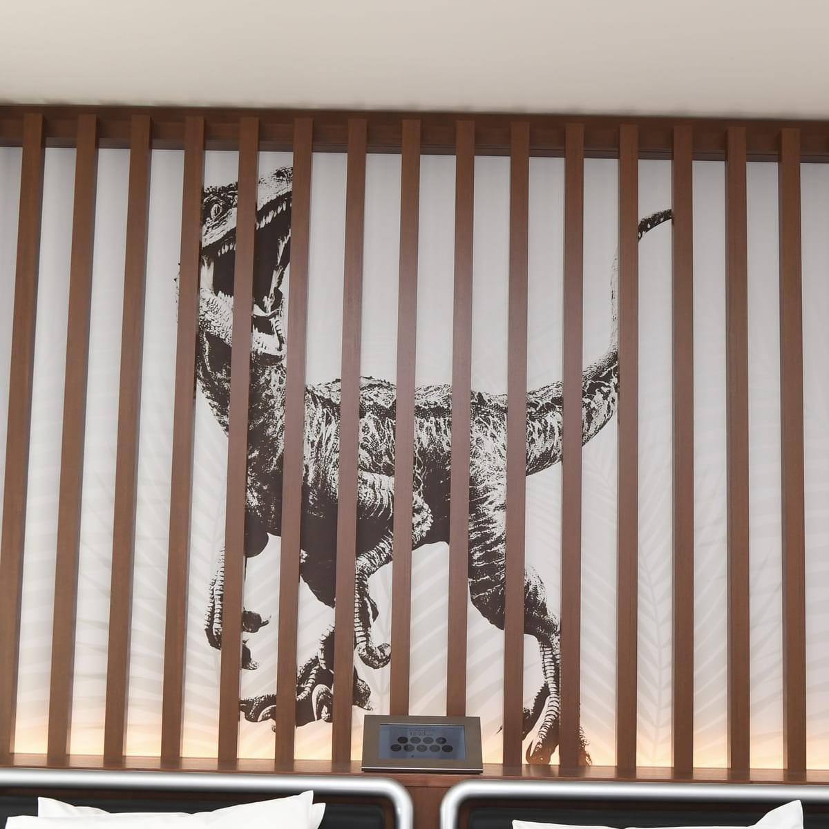 ゲストを狙う恐竜の視線や、ツアービークル型ベッドにワクワクする、 スリル満点なお部屋でも冒険はつづきます☆