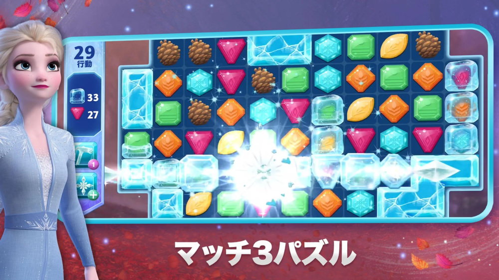 エルサ、アナ、オラフといった映画『アナと雪の女王』でおなじみのキャラクターとともに、3つ以上のブロックをつなげて消す「マッチ3パズル」にチャレンジします。