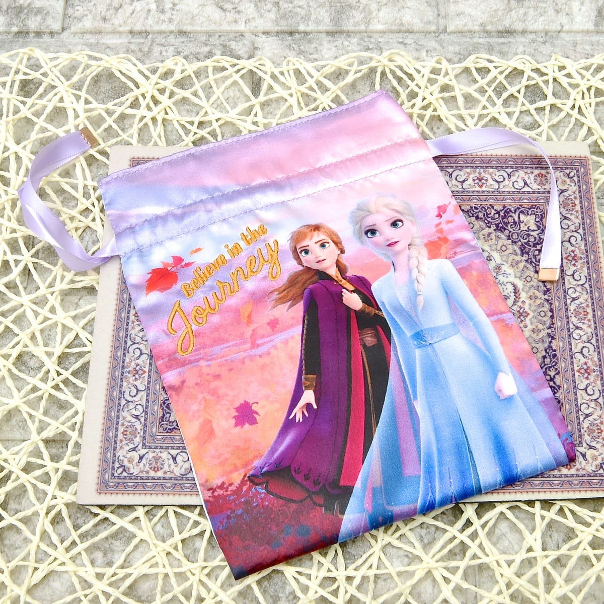 フロントに「アナ」と「エルサ」のアートが大胆にプリントされた「リボン巾着」