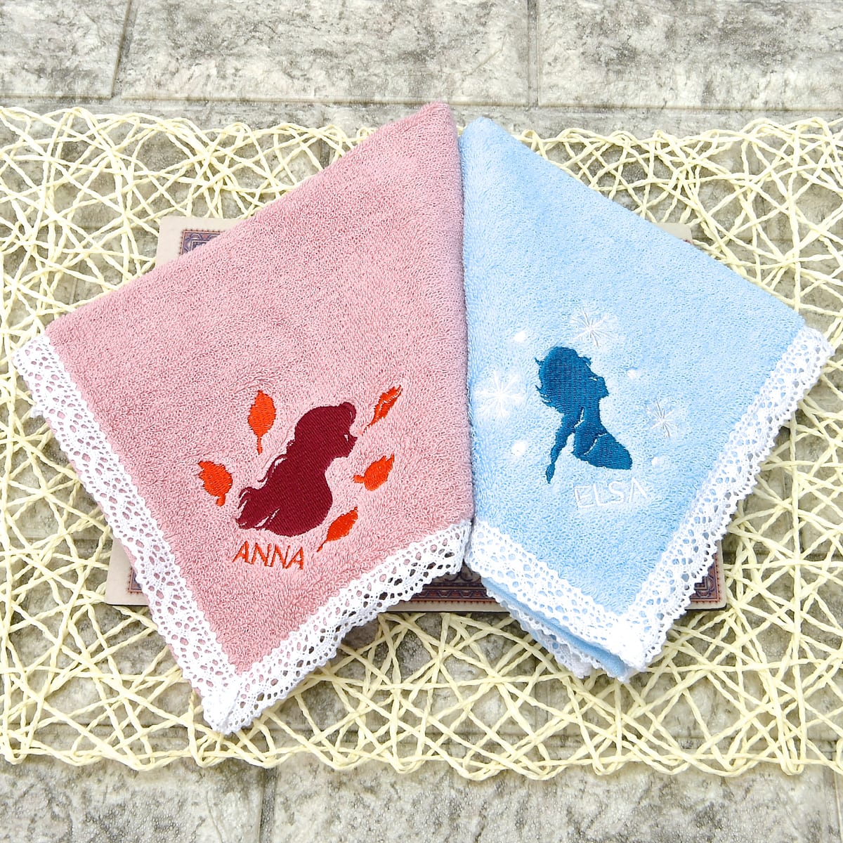 イラスト部分に細やかな刺繍が施された「レース付きハンドタオル」