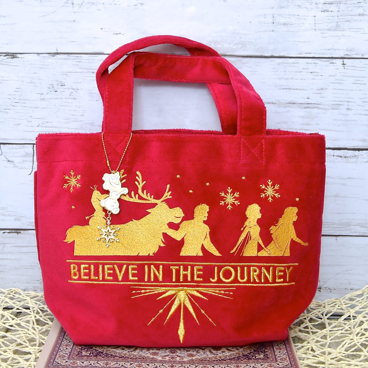 『アナと雪の女王2』に登場するキャラクターたちのシルエットが金箔押しで落とし込まれた、エレガントなトートバッグです。