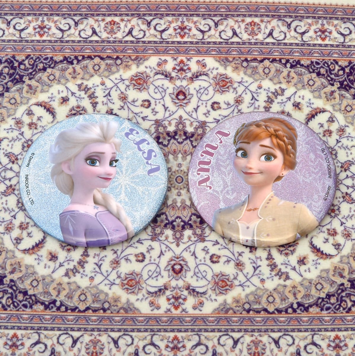 「アナ」と「エルサ」デザインの缶バッジが2個セットになった「グリッター缶バッジセット」