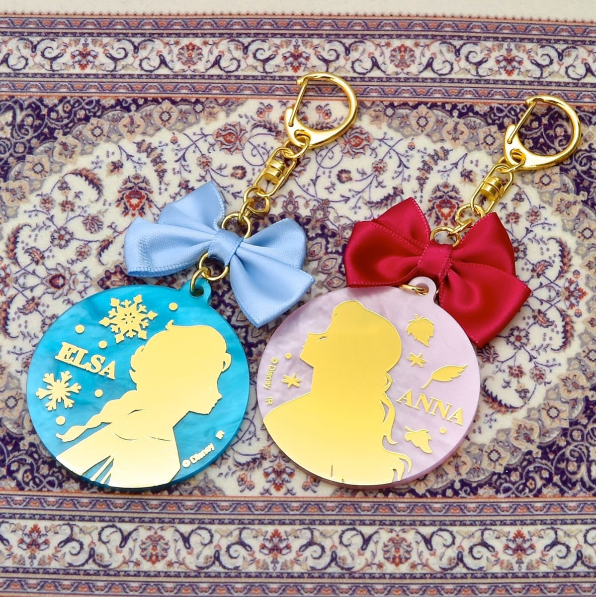 「アナ」と「エルサ」の横顔シルエットが金箔押しでアレンジされた「マーブル アクリルキーホルダー」2種。