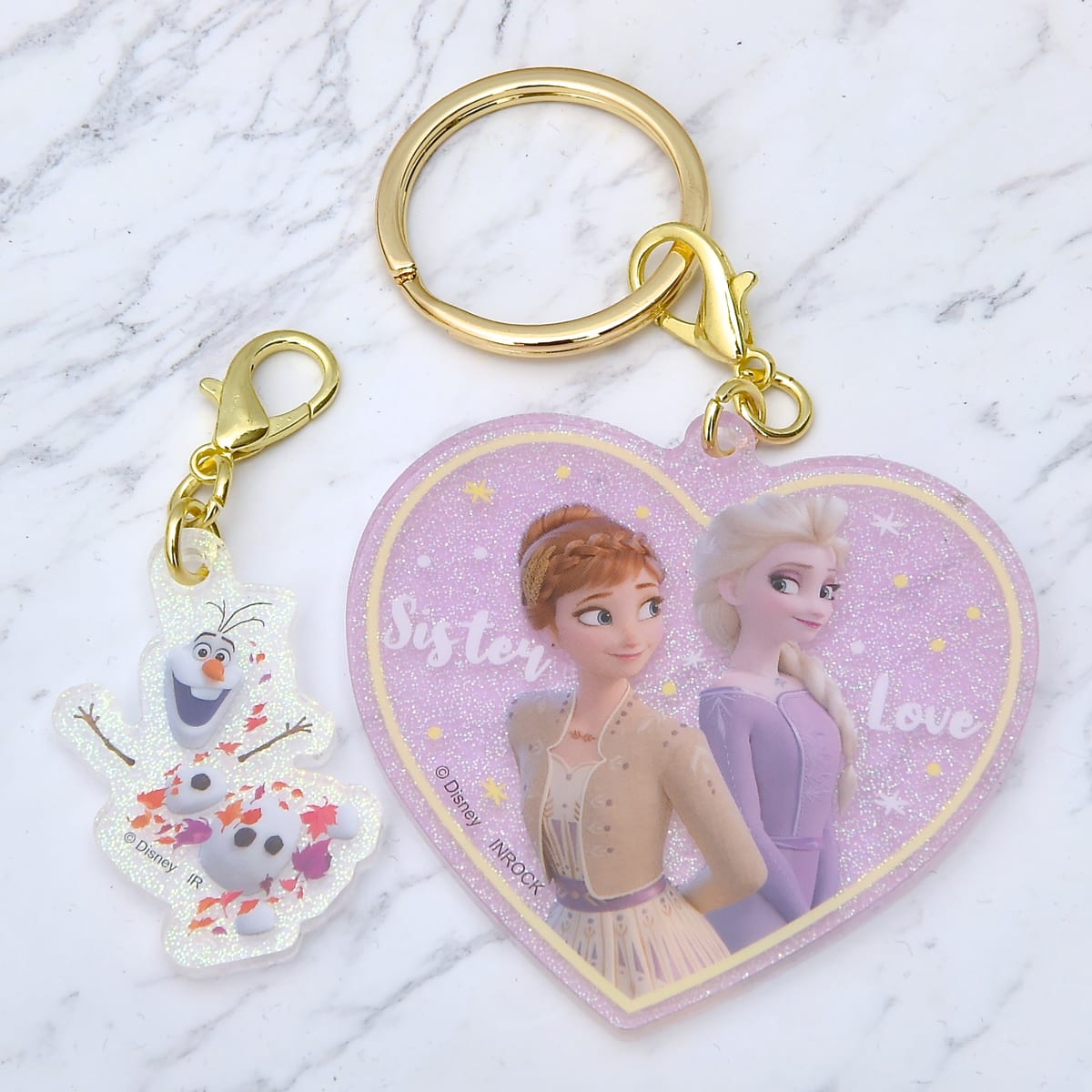 ハート型のチャームに「アナ」と「エルサ」が背中合わせに見つめ合うシーンがプリントされた「ラメ入り2連アクリルキーホルダー」