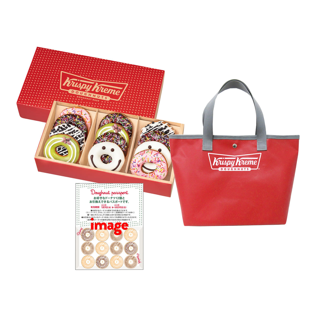 オリジナルのドーナツを丁寧に焼き上げサクッとした軽い食感に仕上げた「ドーナツ ラスク(12個)」、普段使いに重宝しそうな「オリジナルバッグ」、そしてお好きなドーナツ12個と引き換えられる「ドーナツパスポ―ト 2020」の3点セット。