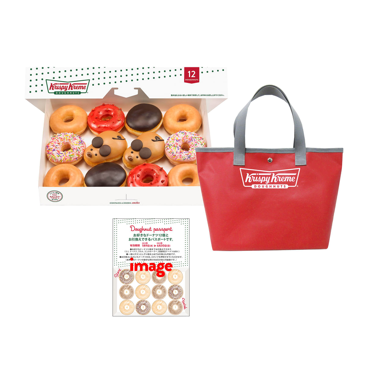 セット内容:福袋アソート ダズン(12個)、オリジナルバッグ(1点)、ドーナツパスポート 2020 (1枚)