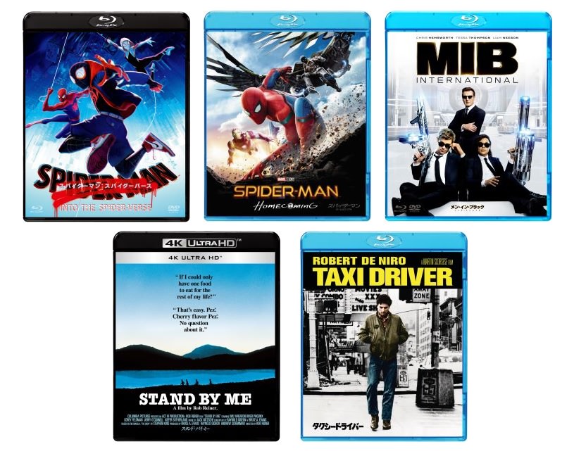 作品名『スパイダーマン:スパイダーバース』『スパイダーマン:ホームカミング』『メン・イン・ブラック:インターナショナル』『スタンド・バイ・ミー 4K ULTRA HD』『タクシードライバー』のうち1本
