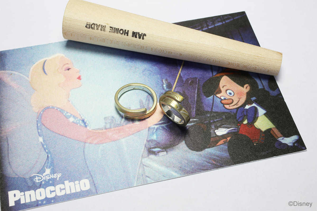 また、指輪に「木目金」の技法を施すことで、木製の手作り人形である「ピノキオ」を表現しています。