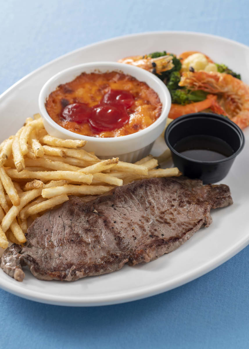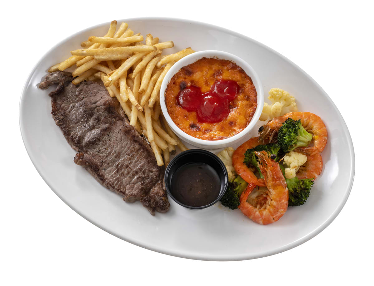 和風ソースのサーロインステーキとマカロニたっぷりのチーズグラタン、ガーリックシュリンプをワンプレートに盛り合わせた、ボリューム満点のメニューです!