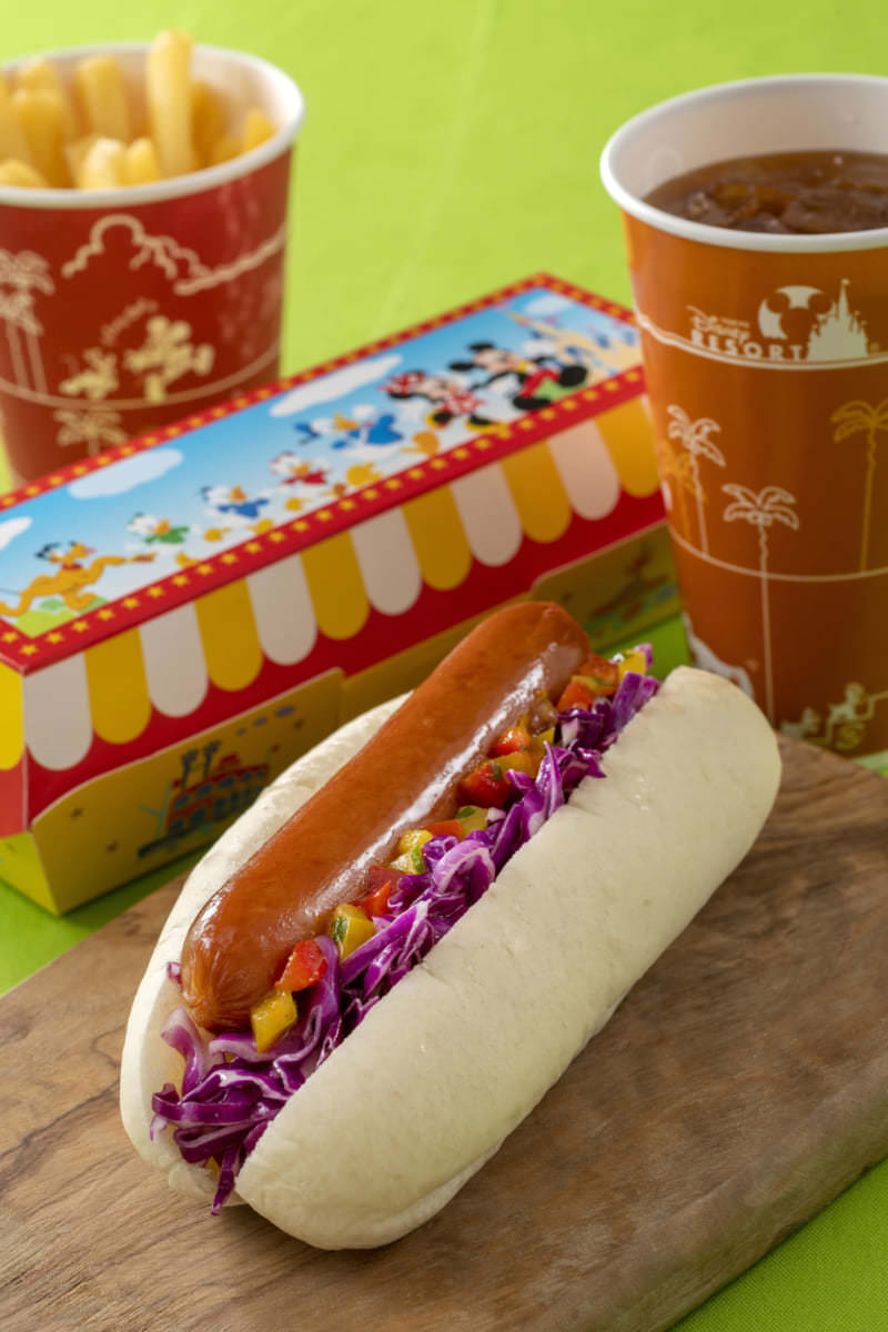 食べごたえのあるソーセージに、紫キャベツや、赤や黄色のパプリカ、パセリなどの色とりどりの野菜を使用することで「ミニーマウス」のカラフルなドレスが表現されています。