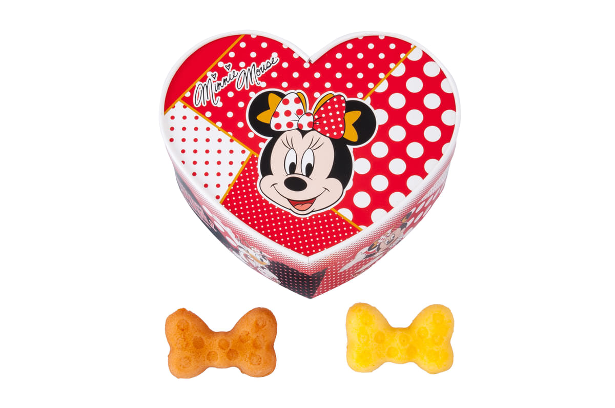 ミニーマウスがデザインされたハート型のケースにはいったマドレーヌ。