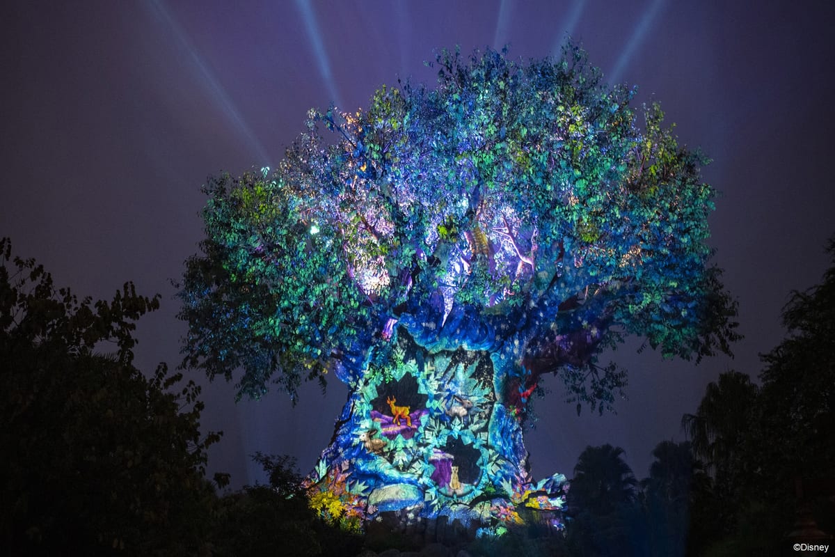 目覚めの時の合間には、自然の魔法とホリデースピリッツに満ちあふれた「ツリー・オブ・ライフ」が夜空をバックにキラキラと輝きます☆