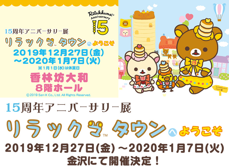 「15周年アニバーサリー展 リラックマタウンへようこそ」が、2019年12月27日(金)から2020年1月7日(火)まで、金沢市の香林坊大和にて開催されます。