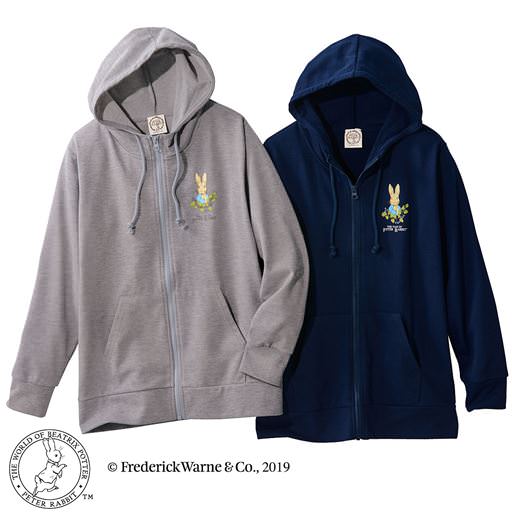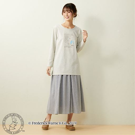 胸元のキュートな「ピーターラビット(TM)」のプリントと高めの前衿が着こなしのポイントに。
