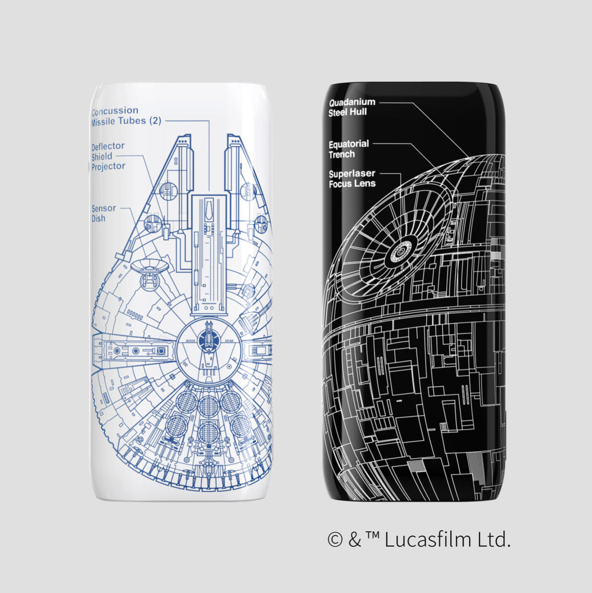 「スター・ウォーズ」に登場する「ミレニアム・ファルコン」と「デス・スター」のデザインが施された限定モデルの「モバイルバッテリー」