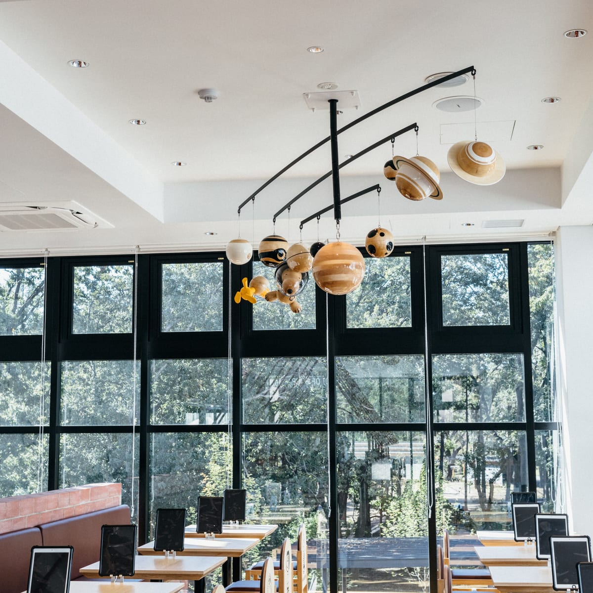 天井には、「知育」をテーマにした国内外で人気のプロダクトブランド〈tegoto(テゴト)〉と コラボレーションした、特大サイズのモビールが癒しの空間を作ります。