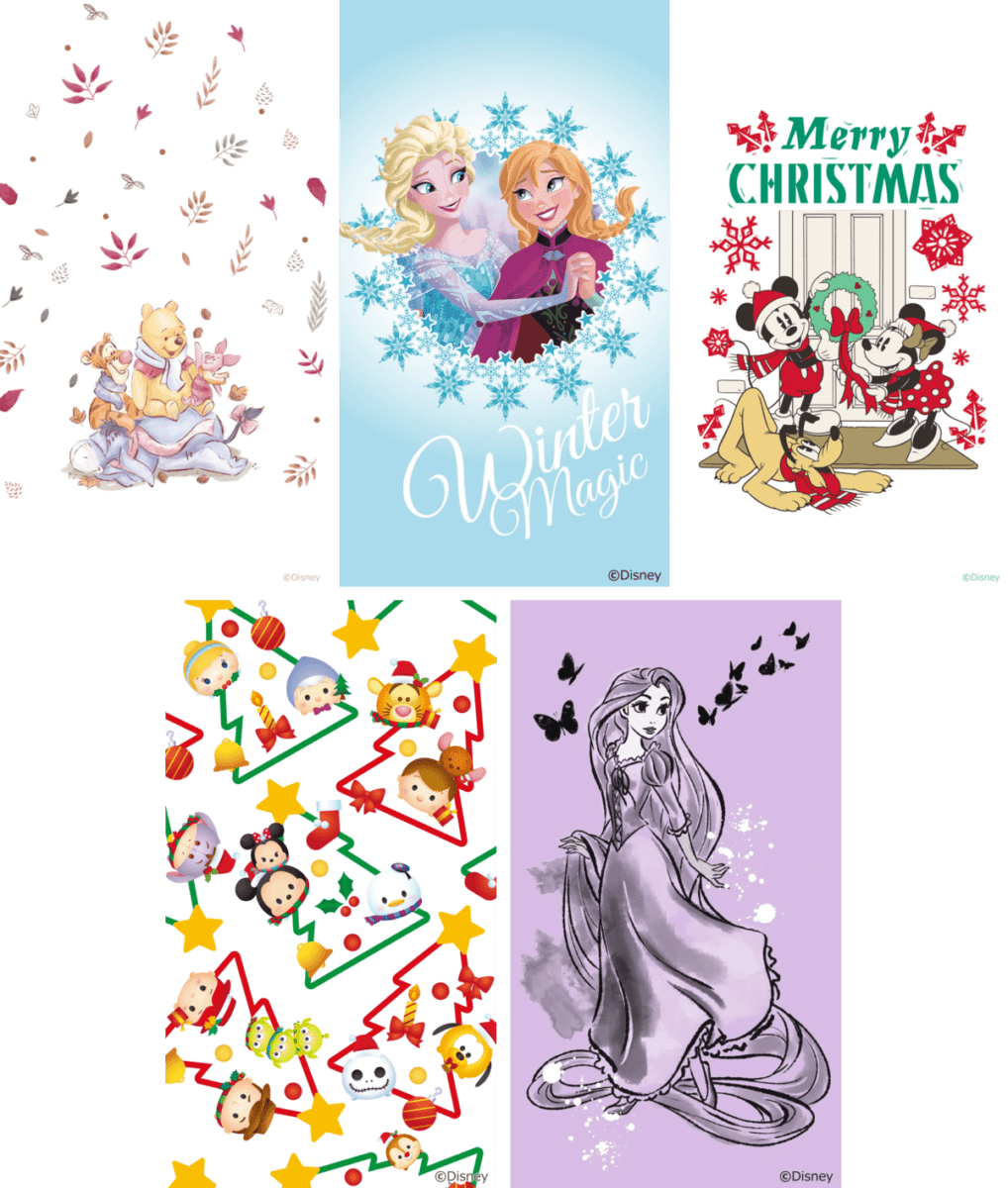 映画も話題の『アナと雪の女王』からは「アナ」と「エルサ」、クリスマスルックのレトロな「ミッキー」、「ミニー」、「プルート」、『塔の上のラプンツェル』のディズニープリンセス「ラプンツェル」 、ほっこりと温かみのあるデザインの『くまのプーさん』、クリスマスツリーのオーナメントに扮した「ディズニーツムツム」など冬らしさ溢れる5種類です。