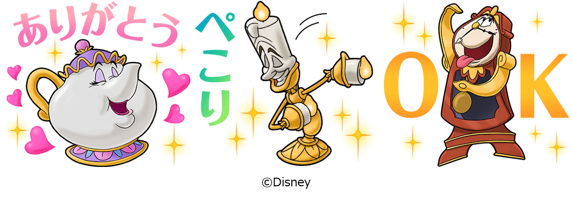毎日の会話に使いやすい、『美女と野獣』の仲間たちのスタンプ。
