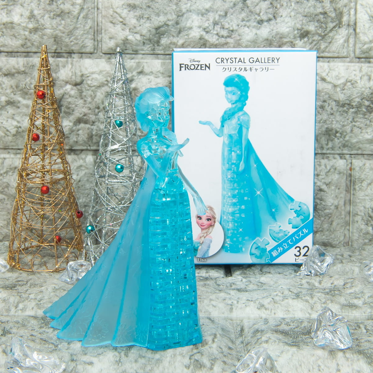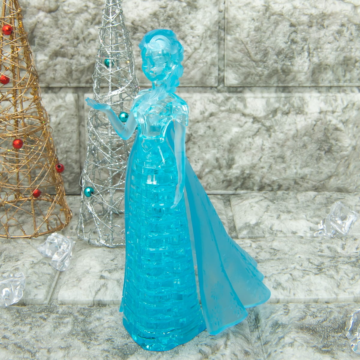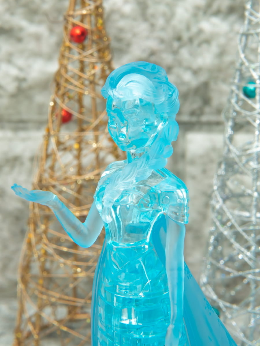 ライトブルーの透明立体ピースを組み上げると、きらきらと輝く美しい「エルサ」が出来上がるパズルです。