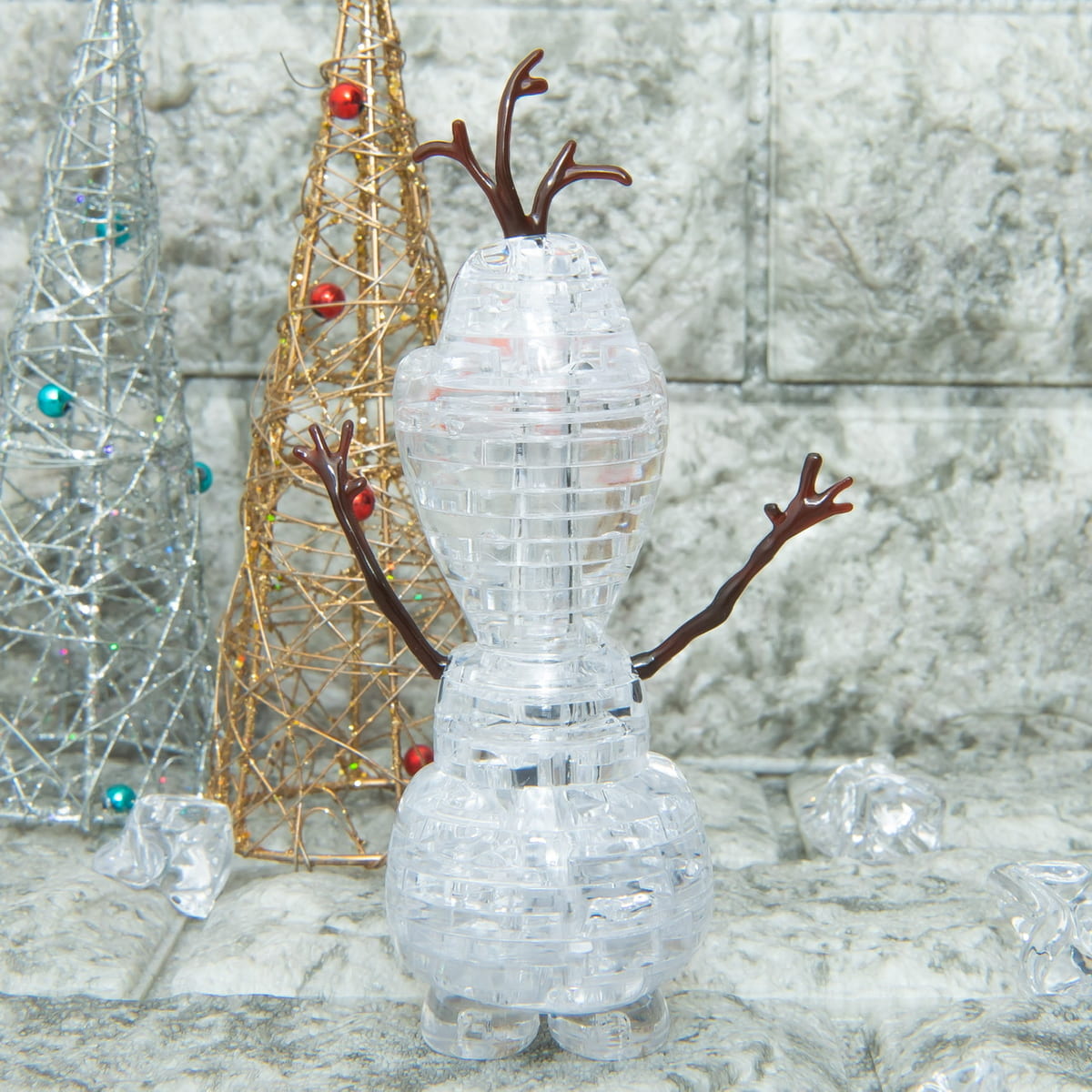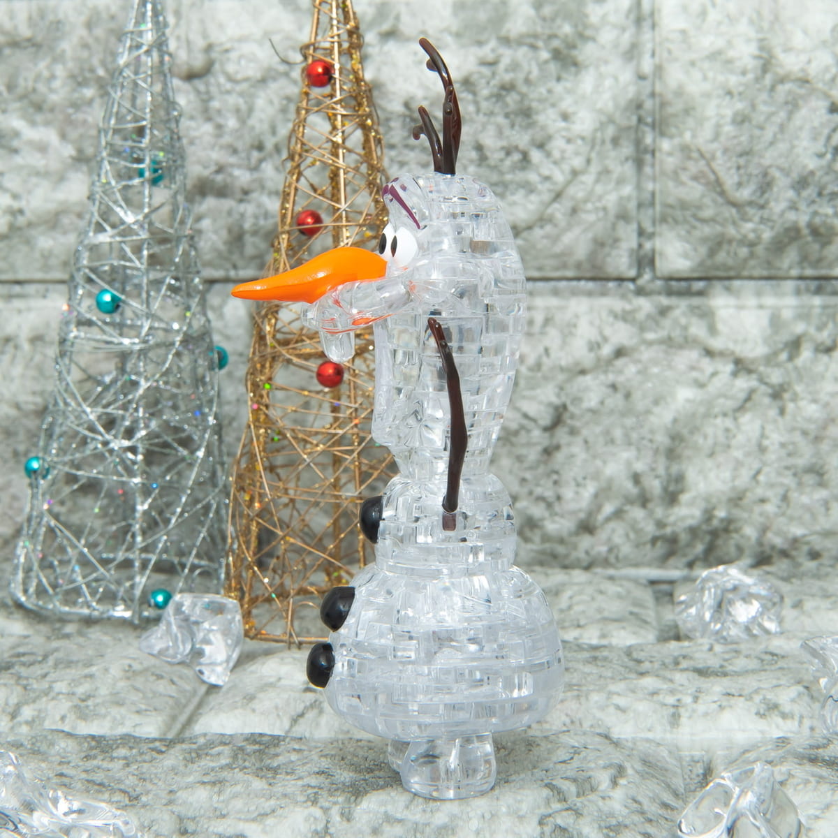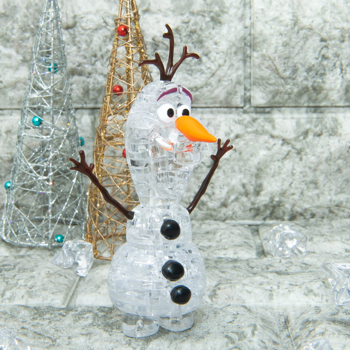 「オラフ」の真っ白なボディが透明素材で再現されたパズルです。