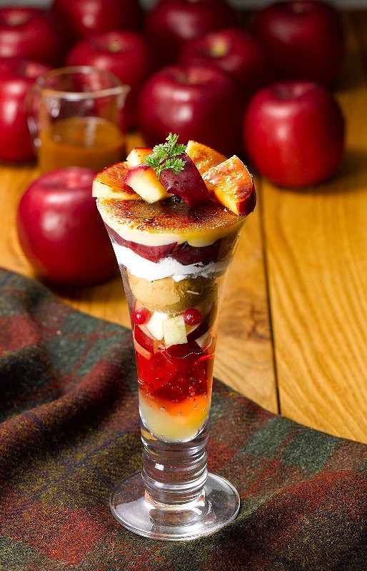フレッシュなりんご、焼きりんご、りんごのソルベやゼリーなど、1つのパフェの中で、層ごとに異なる味わいが続きます。