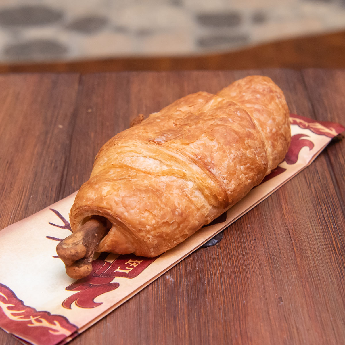 「ガストン」さながらに豪快にかぶりつける骨付きソーセージ入りのクロワッサン。
