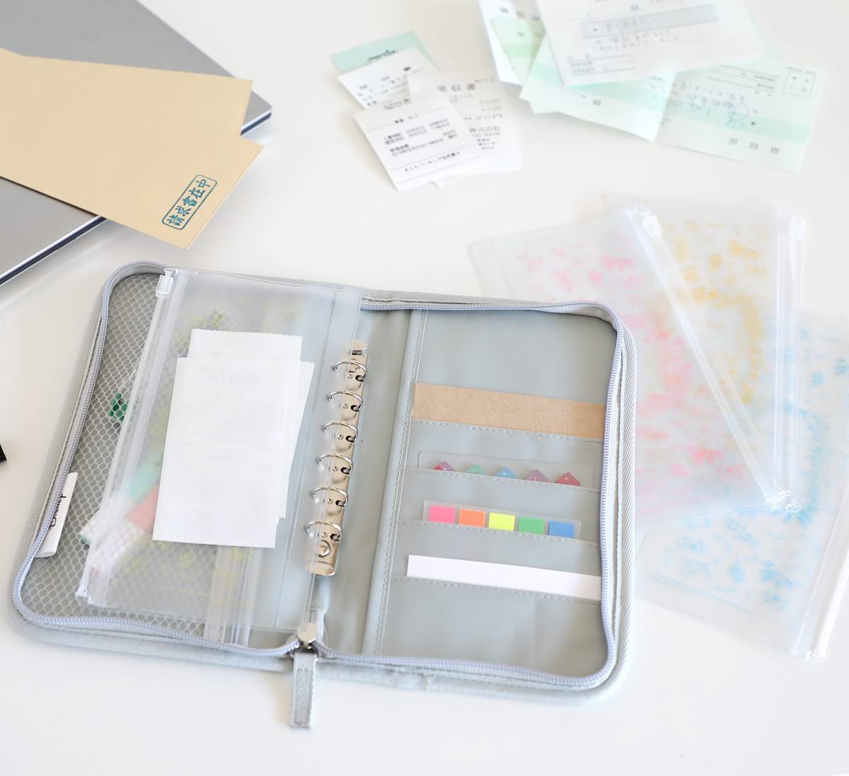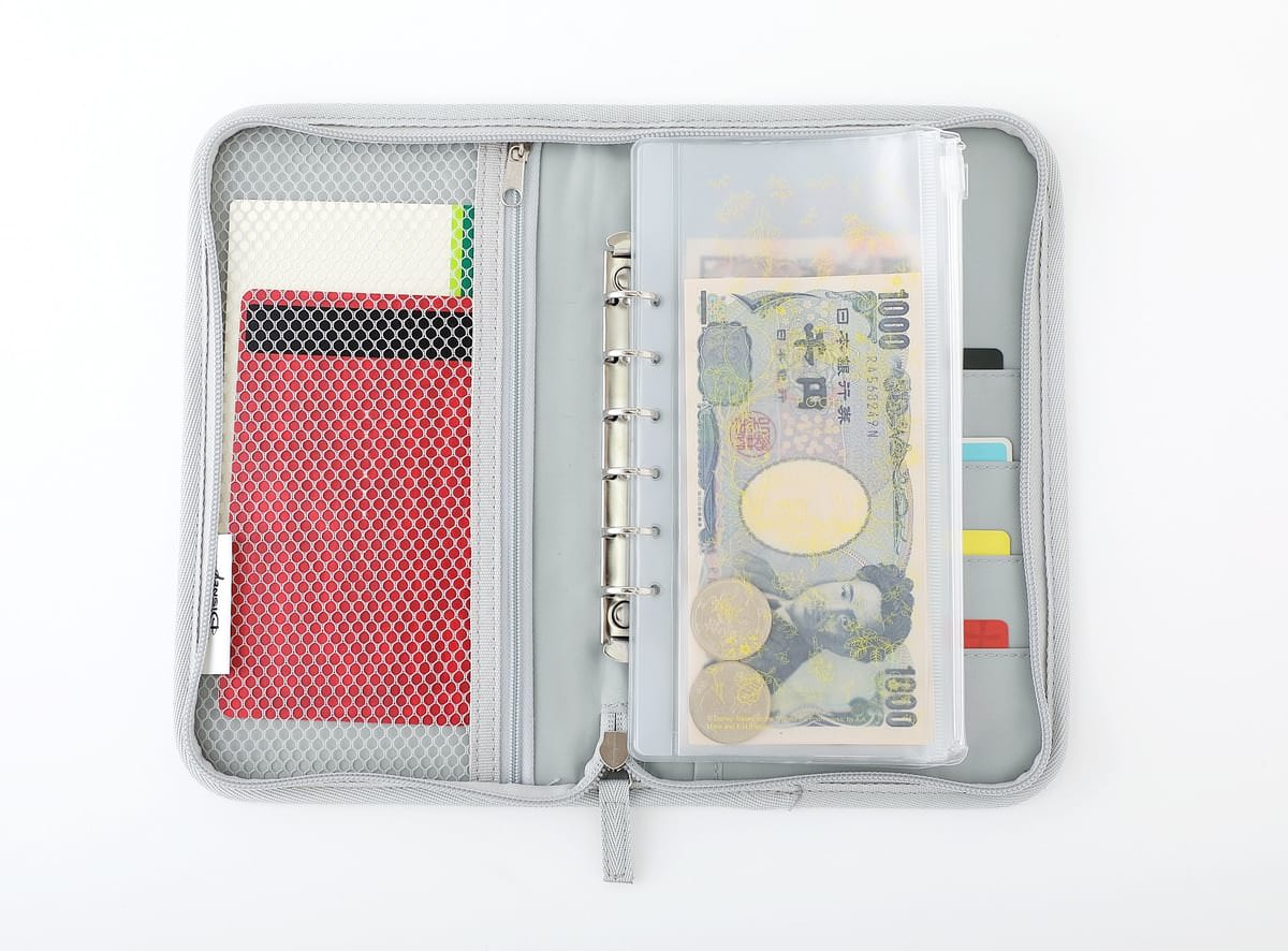 ポーチを開くと、6穴式のバインダーにクリアポケットが4つセットされており、カテゴリーごとにお金を分けて入れるだけで予算管理ができます!