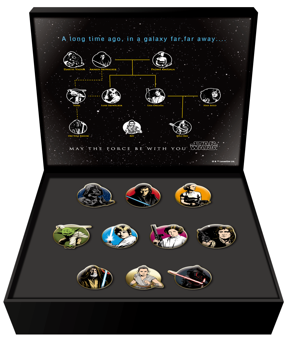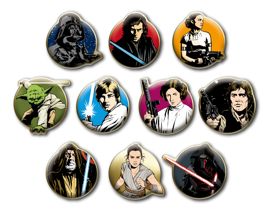 42年にも及ぶ壮⼤なサーガの中で、物語の中⼼となるスカイウォーカー家との関わりが強い10キャラクターが、オリジナルのピンバッジのセットとなって登場。