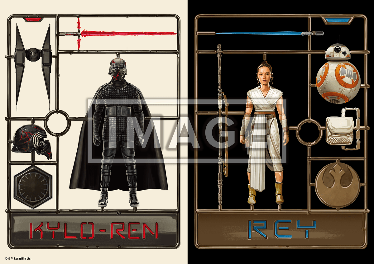 プラモ風のアートで「カイロ・レン」と「レイ」がプリントされた、遊び心あふれるポスターが登場。