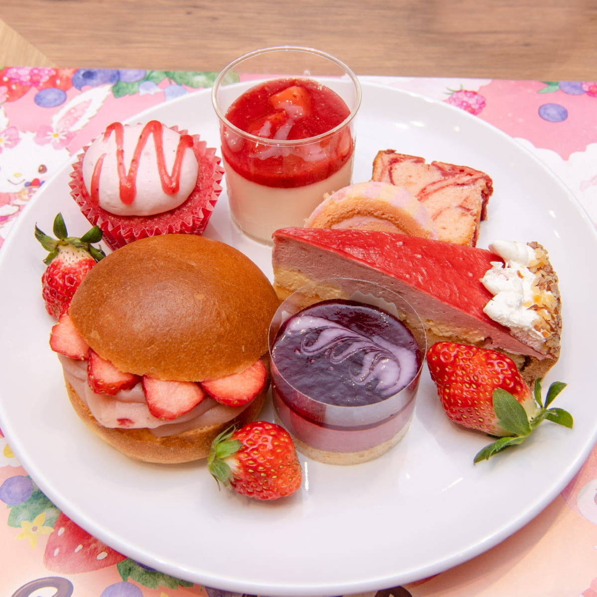 食べるのがもったいないほどかわいいキティの大福がのった「キティのいちごバウム串」や、マイメロディのお顔のロールケーキがのった「マイメロディのいちごの贅沢チョコタルト」など、キャラクターモチーフのデザートメニューがラインナップ。