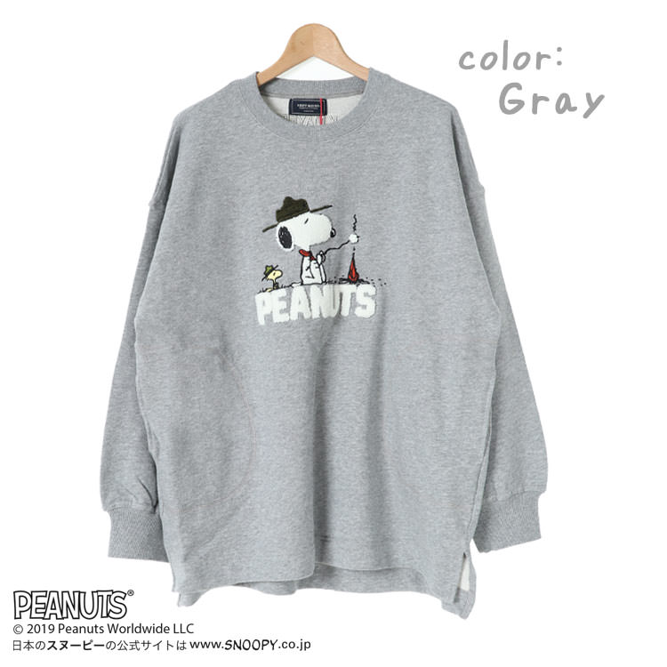 「スヌーピー」と「ウッドストック」が焚き火を楽しむ温かみのあるグラフィックが可愛らしいスウェットクルー。