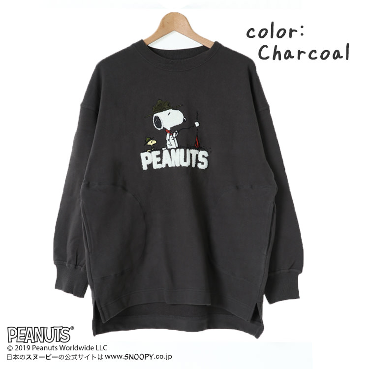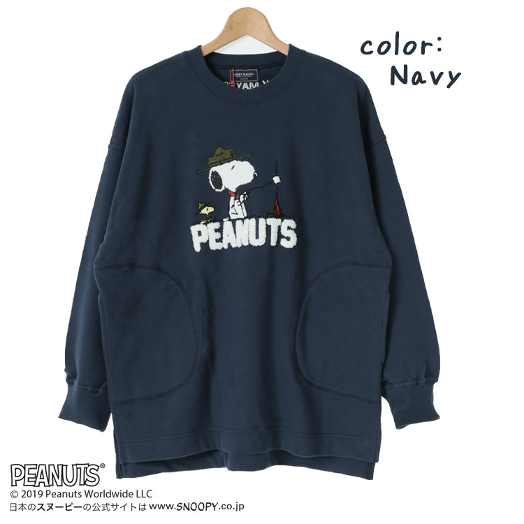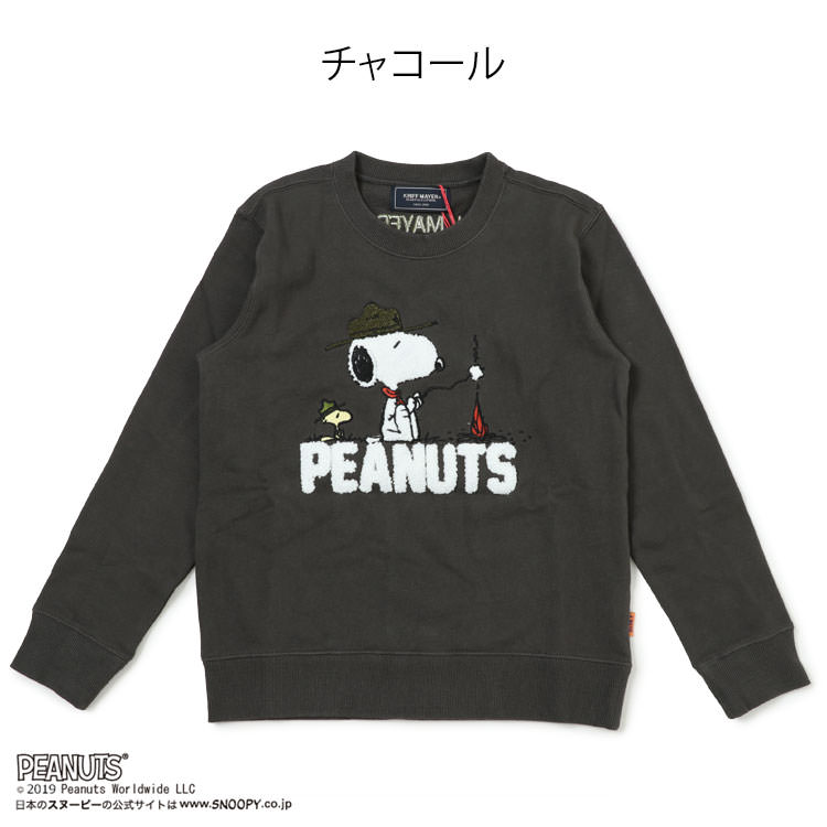 「スヌーピー」が焚き火でマシュマロを焼いているグラフィックが温かみのあるクルースウェット。