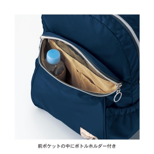 マチを大きくとった前ポケットには、ペットボトルやデジカメもすっぽりと収まり、メッシュポケットには鍵やチケットを収納することもできます。