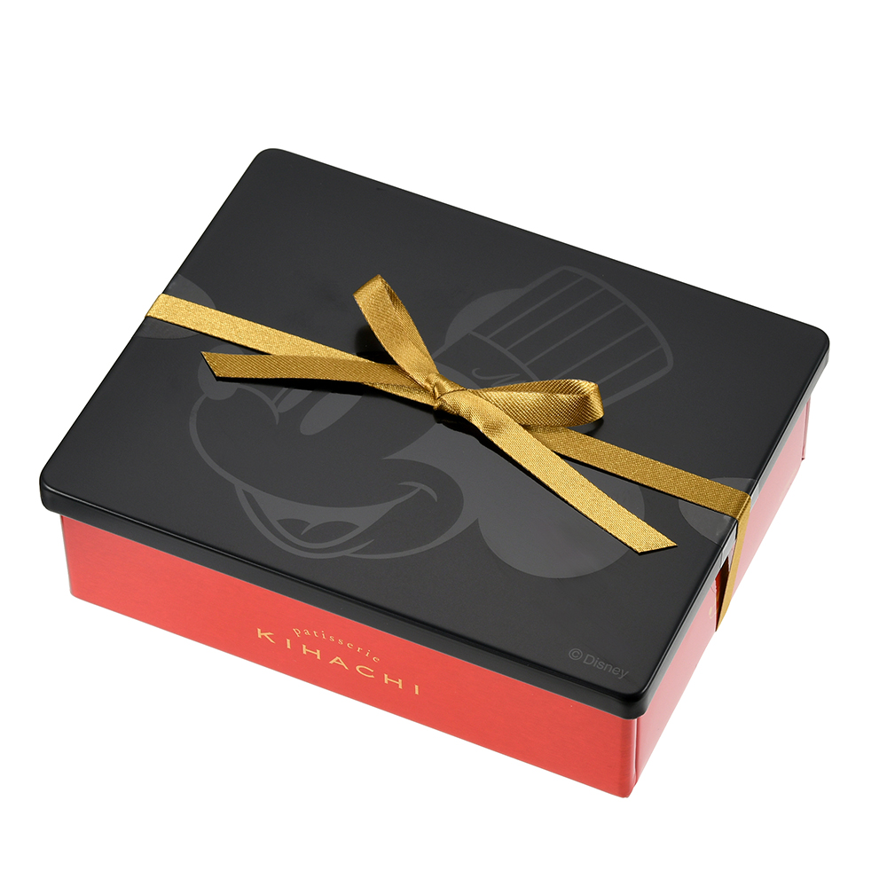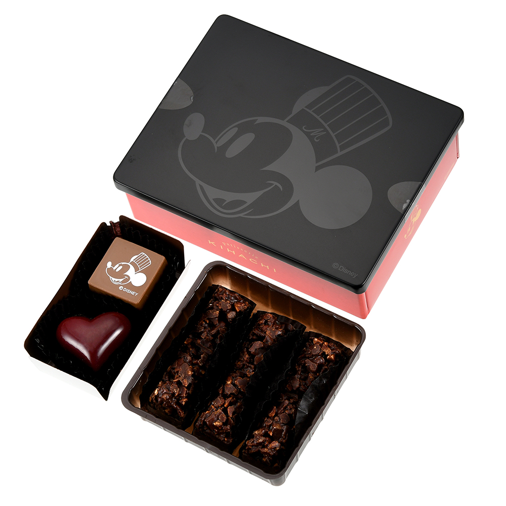 ブラックとブラウンのカラーブロックデザインが大人っぽいスクエア缶で登場する「ミッキー ショコラアソート Patissier Mickey」