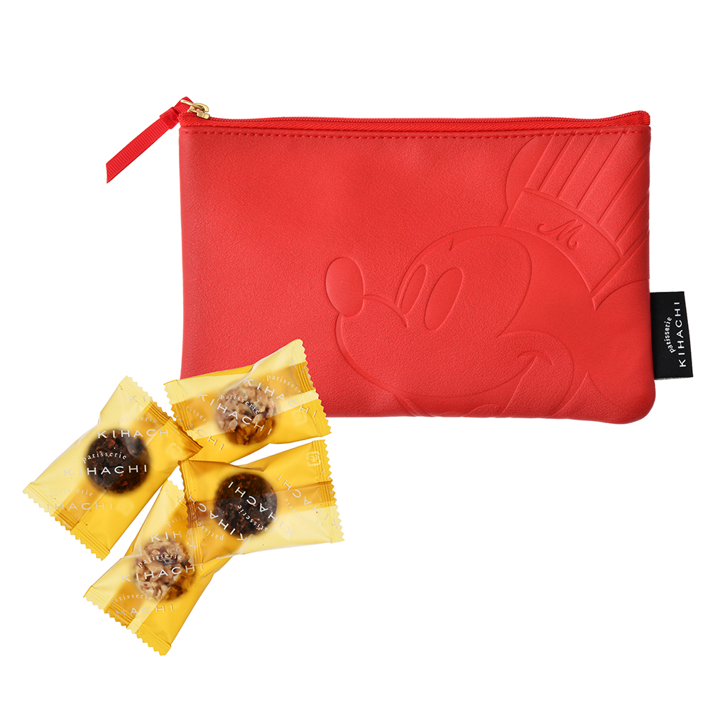 厚みのあるしっかりとしたレザー風ポーチに「ミッキーマウス」のフェイスがデザインされた「ミッキー クランチショコラポーチ Patissier Mickey」