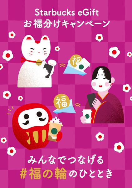 また、Starbucks eGiftでは、eGiftを貰った人からまた他の方に無料でeGiftを贈ることができるStarbucks eGiftお福分けキャンペーン「みんなでつなげる#福の輪 のひととき」を実施。