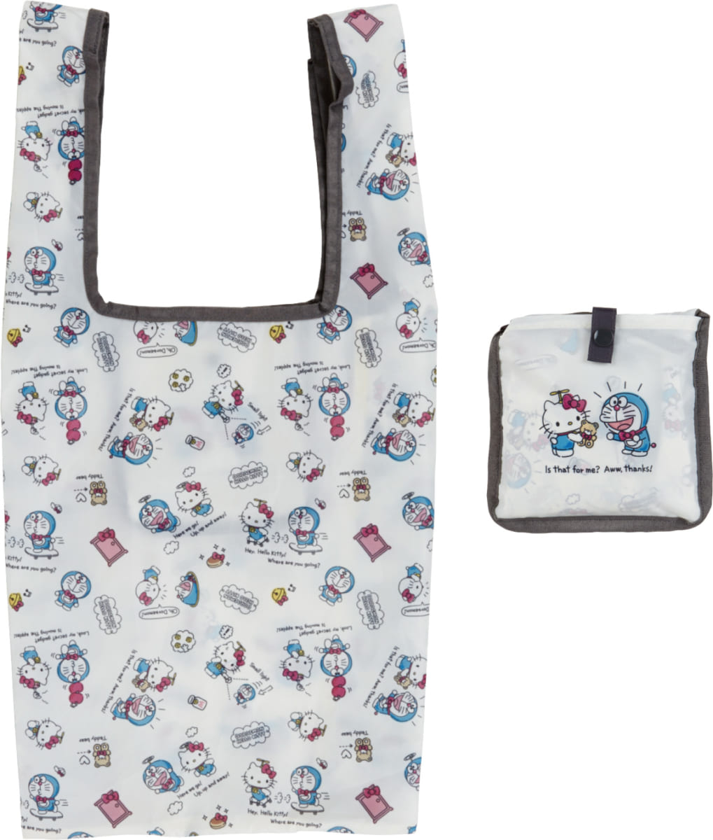 バッグには「ハローキティ」と「ドラえもん」のアートが総柄でプリントされています。
