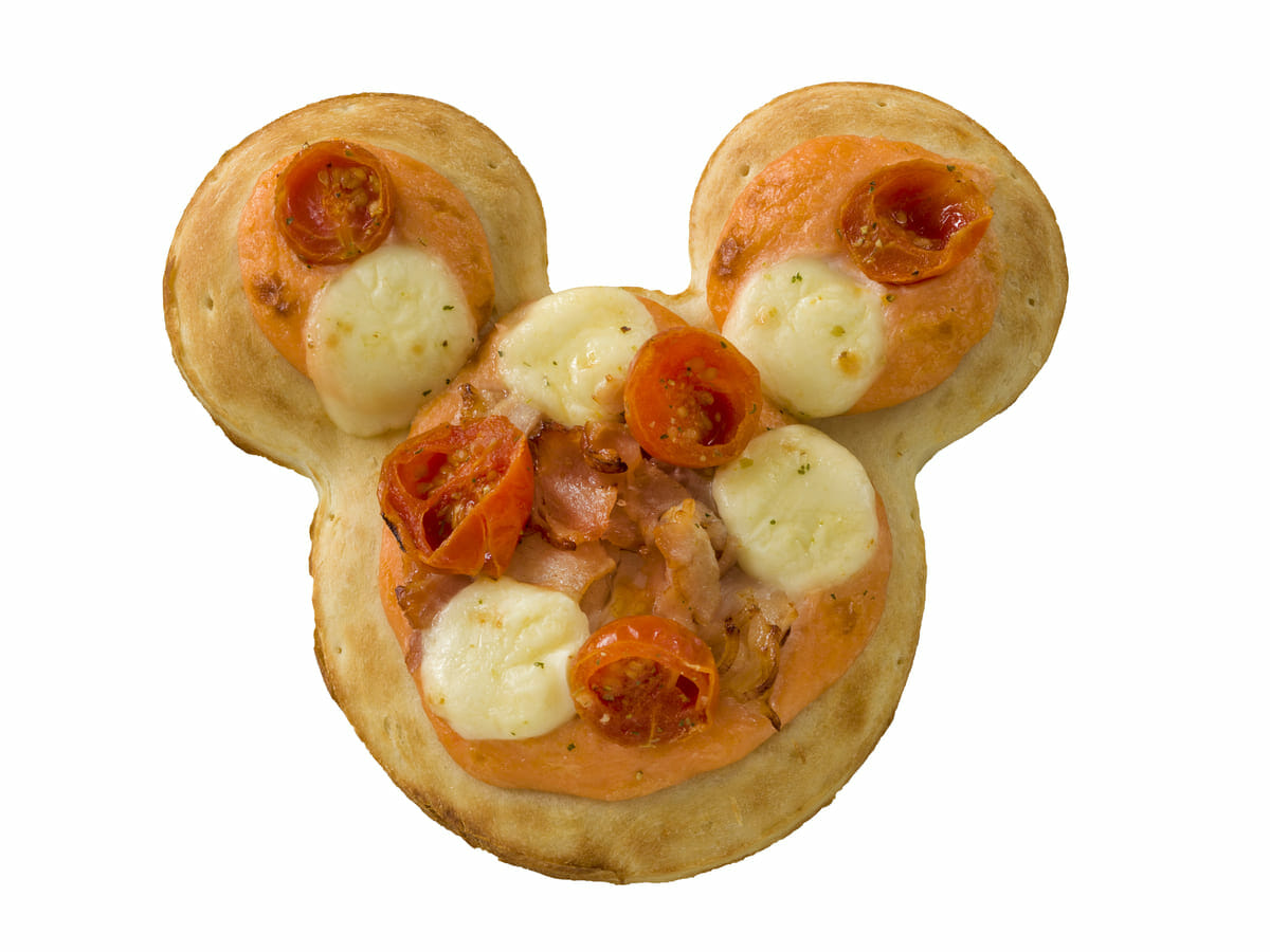 定番パークフードのミッキーピザをトマトとモッツァレッラチーズで水玉をあしらったミニーマウスモチーフにアレンジ。