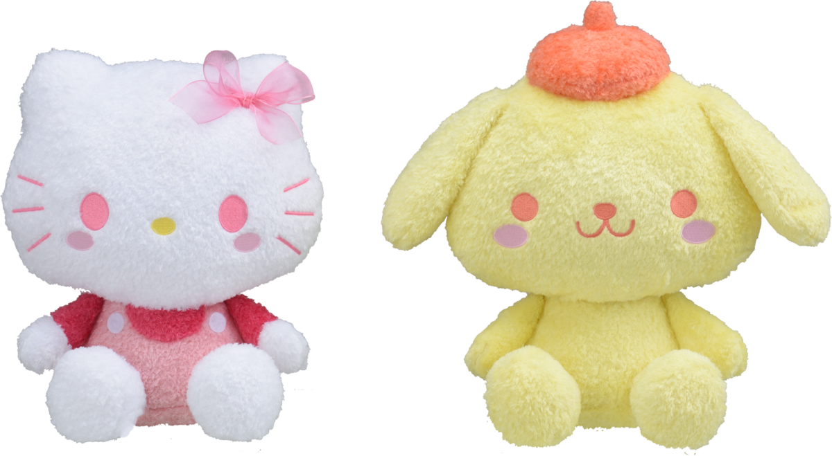 ゆるかわデザインの「ハローキティ」と「ポムポムプリン」のぬいぐるみ。