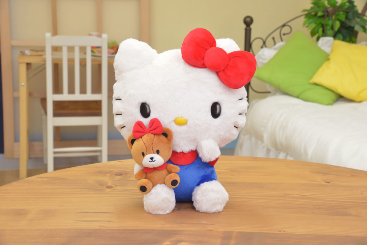 「タイニーチャム」を抱きしめた「ハローキティ」のぬいぐるみ。