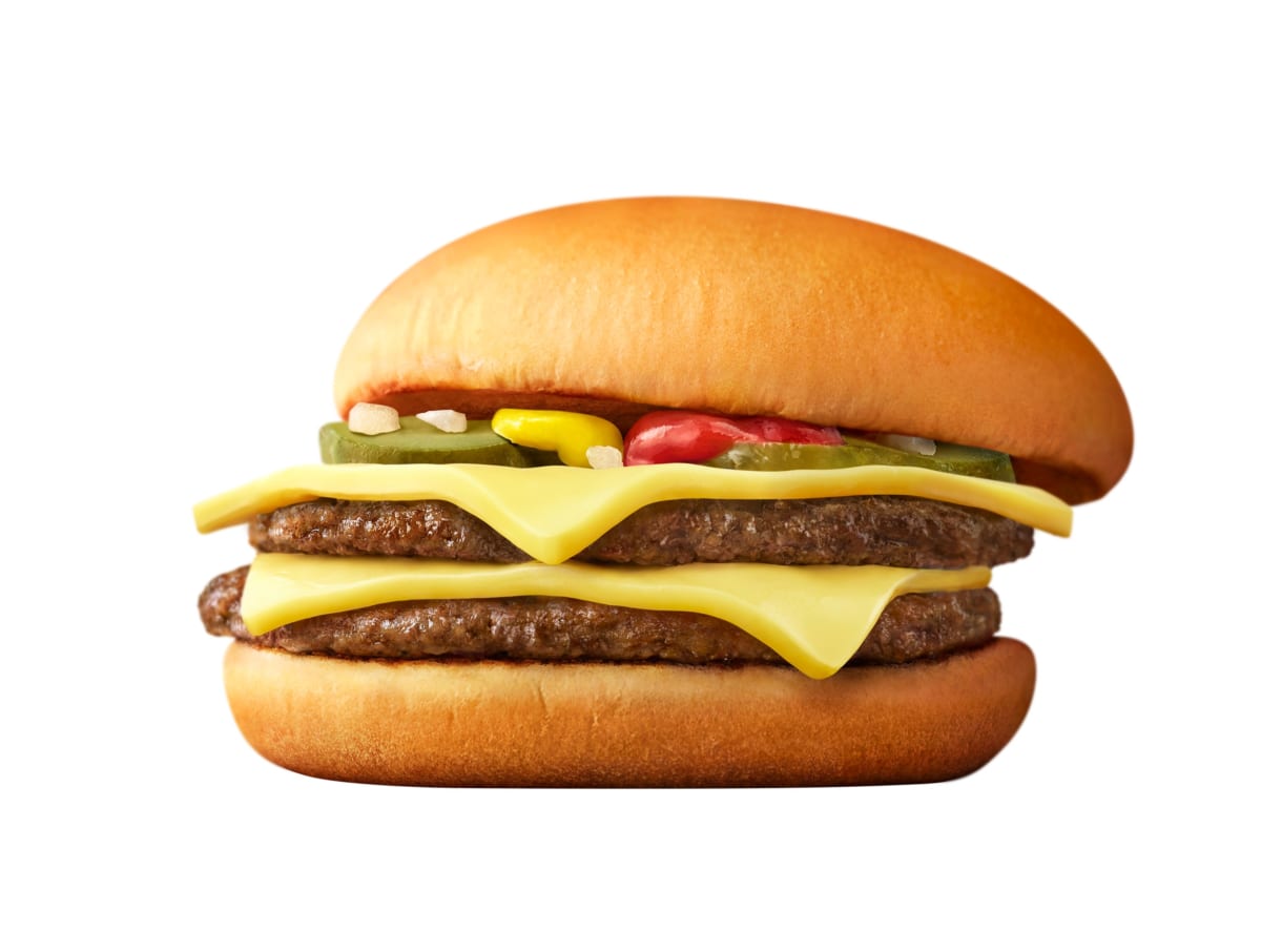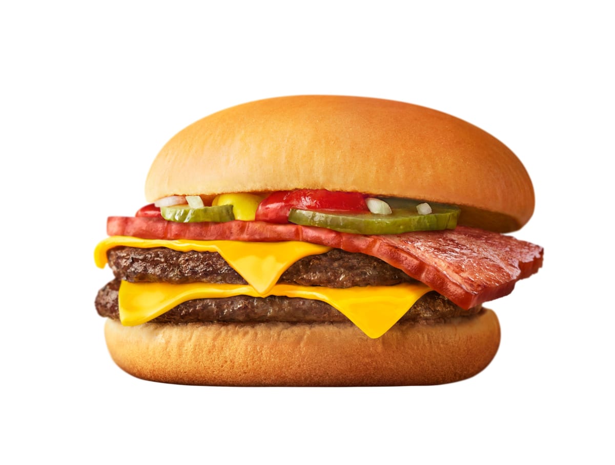2枚のジューシーな100%ビーフパティと2枚のチェダーチーズでコクのある旨みが人気の「ダブルチーズバーガー」に、厚切りでリッチになったスモーキーなベーコンを加えた「アツ!ベーダブチ」
