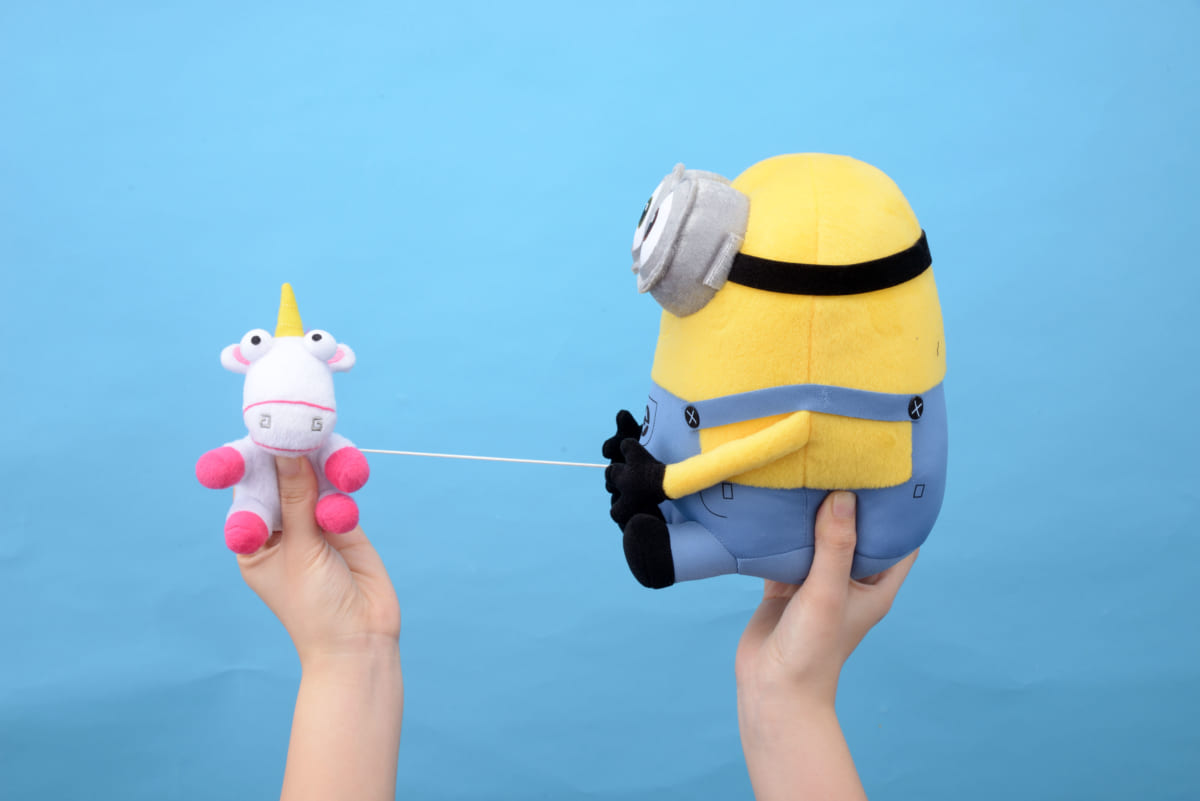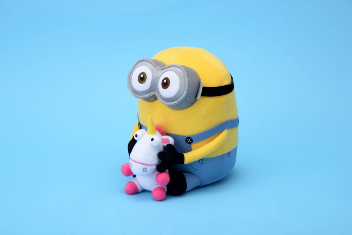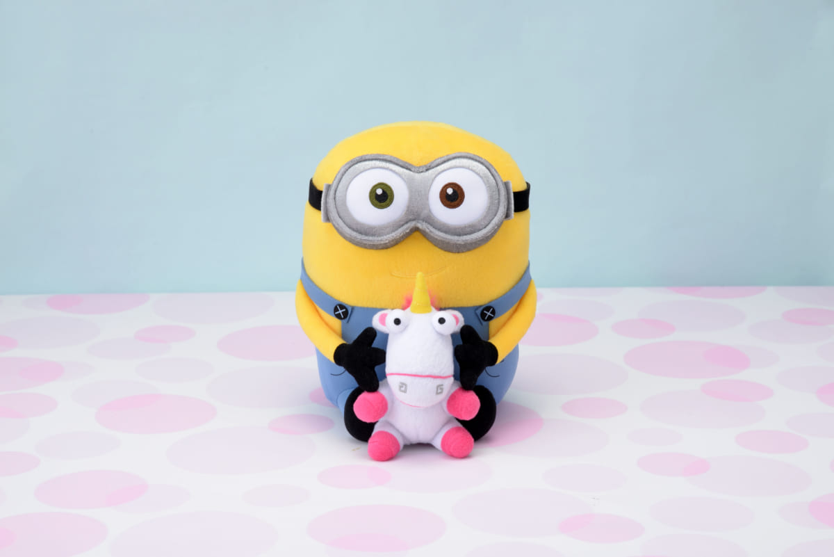 映画『怪盗グルー』シリーズに登場する三姉妹の末っ子「アグネス」が肌身離さず持ち歩くユニコーンのぬいぐるみ「フラッフィ」とミニオンの「ボブ」の楽しい組み合わせ☆