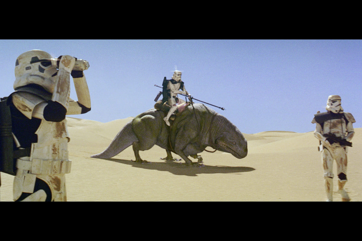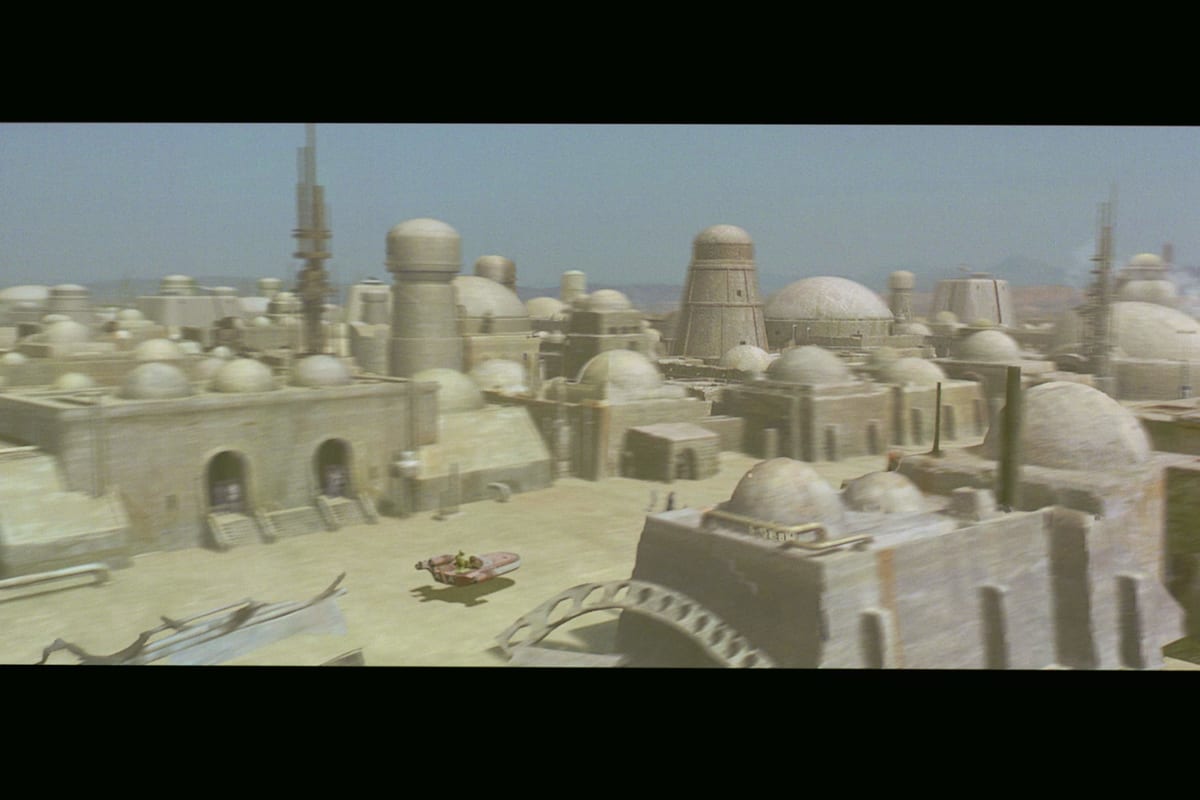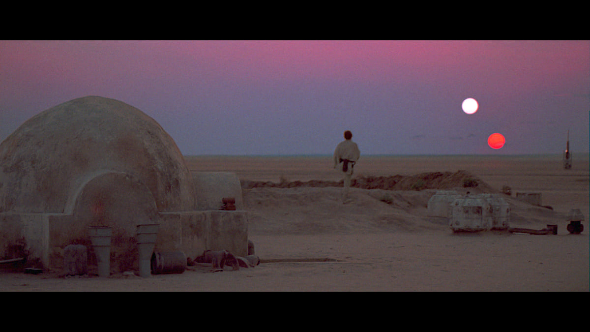 一方、砂漠の惑星タトゥイーンで暮らす青年ルーク・スカイウォーカーは、タトゥイーンに到着したもののジャワたちに捕まって売り飛ばされてしまっていたR2-D2と通訳ドロイドC-3PO、2体のドロイドを偶然手にします。