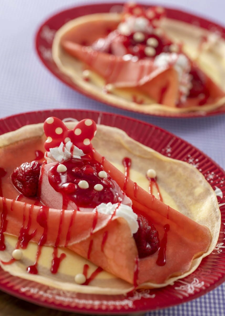 今回は、ミニーマウスの可愛らしさがギュッとつまったスペシャルメニューの中から「カフェ・オーリンズ」で提供されるスペシャルクレープ「ストロベリーチーズブラウニークレープ」を紹介します☆