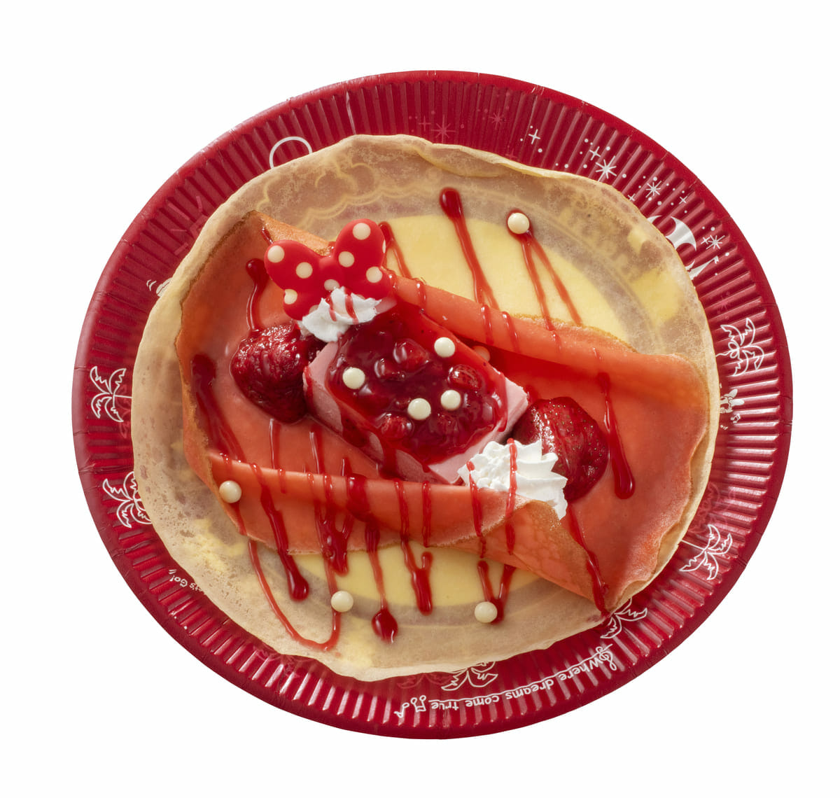 東京ディズニーランド/アドベンチャーランドにある店内で焼き上げるさまざまなクレープが大人気のレストラン「カフェ・オーリンズ」では、“ベリー・ベリー・ミニー!”開催中、スペシャルクレープ「ストロベリーチーズブラウニークレープ」を提供。